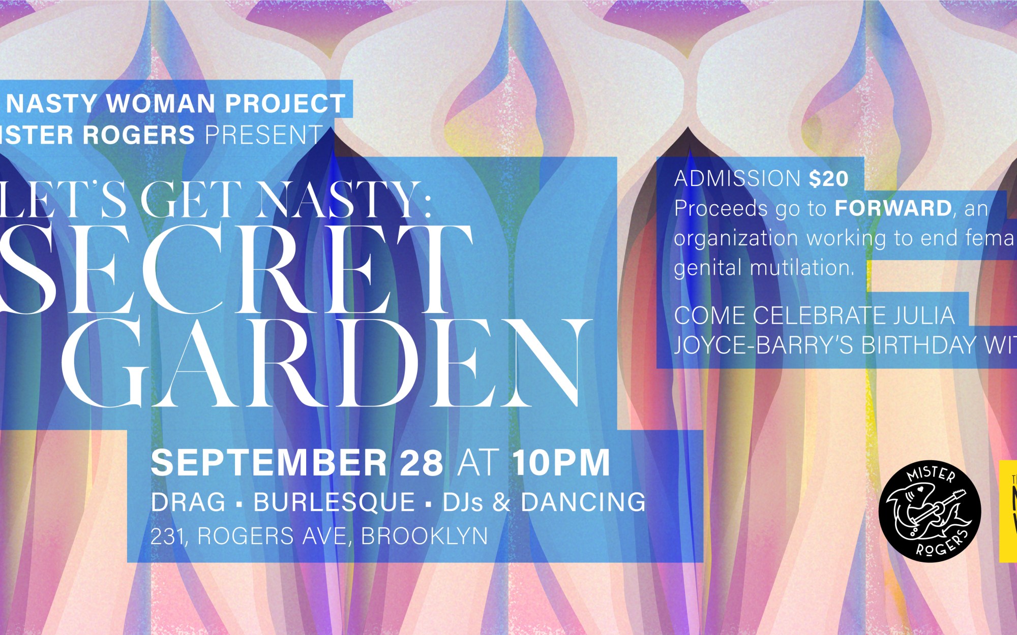 The Nasty Woman Project and Mister Rogers present their 4th annual charity event—Let’s Get Nasty: Secret Garden. Burlesque, drag, and DJ performances will light up the stage all night long, in celebration of Nasty Woman Julia Joyce-Barry’s birthday.